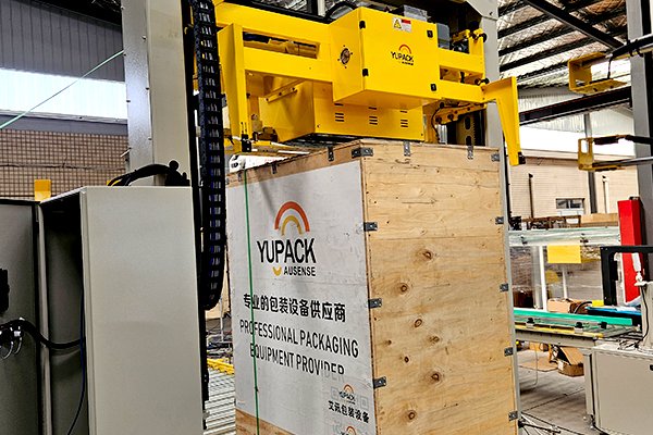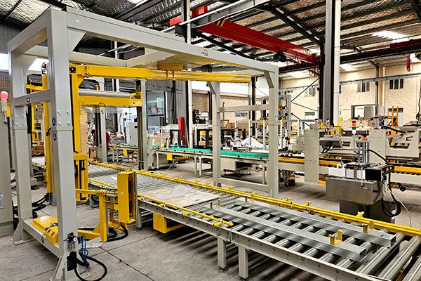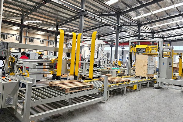 電動工具托盤碼垛通過式覆頂膜纏繞捆扎包裝線,是由自適應型供棧機、機器人碼垛機、棧板穿劍捆扎機、通過式覆頂膜機以及搖臂式纏繞包裝機組合而成。自適應型供棧機可根據不同托盤尺寸,自動調整機器并分配托盤,節省了人工換產的時間。