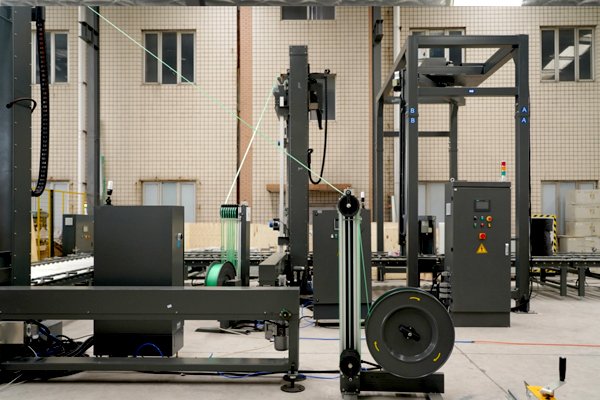 瓦楞紙板捆扎纏繞包裝線2臺頂壓式托盤穿劍捆扎機(jī)、1臺搖臂式纏繞包裝機(jī)以及若干滾筒輸送機(jī)組成。針對瓦楞紙板比較蓬松的特性,該線體配備了帶下壓功能的托盤捆扎機(jī),最大壓力可達(dá)500kg,有效降低包裝體積,同時(shí)讓包裝物更加緊實(shí),防止運(yùn)輸過程中的散落。