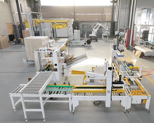 玉米面條十字封箱機是由開箱機、折蓋封箱機、90度轉向機構、半自動一字封箱機以及協作機器人碼垛機組成,該線體根據用戶現場比較緊湊的實際情況而設計,開箱機出料口高度較高,在成品紙箱上面,成品紙箱輸送機2側坐人進行裝箱,抬手即可拿取空紙箱,大大減少了設備的占地面積,同時方便用戶的實際操作。尾端配備協作機器人碼垛機,占地面積小,成本低,雙抓設計,工作效率高,特別適用食品類小紙箱的開封箱碼垛包裝。