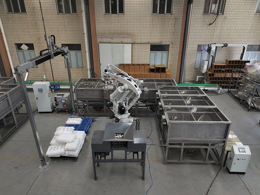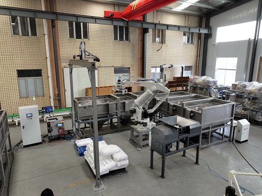 袋子卸垛是目前包裝領域非常常見的一種需求方式,用戶需要對托盤上的袋子進行卸垛,同時需要將卸下來的袋子進行破包,將內部物料倒入提前準備好的料斗里,有可能只有一種物料,有時也有可能是多種物料按照一定的比例混入料斗中,之后分別輸送到指定位置。而破袋后的袋子,有的需要緩存到其他的料箱中,而有的則需要直接粉碎后,再次回收。